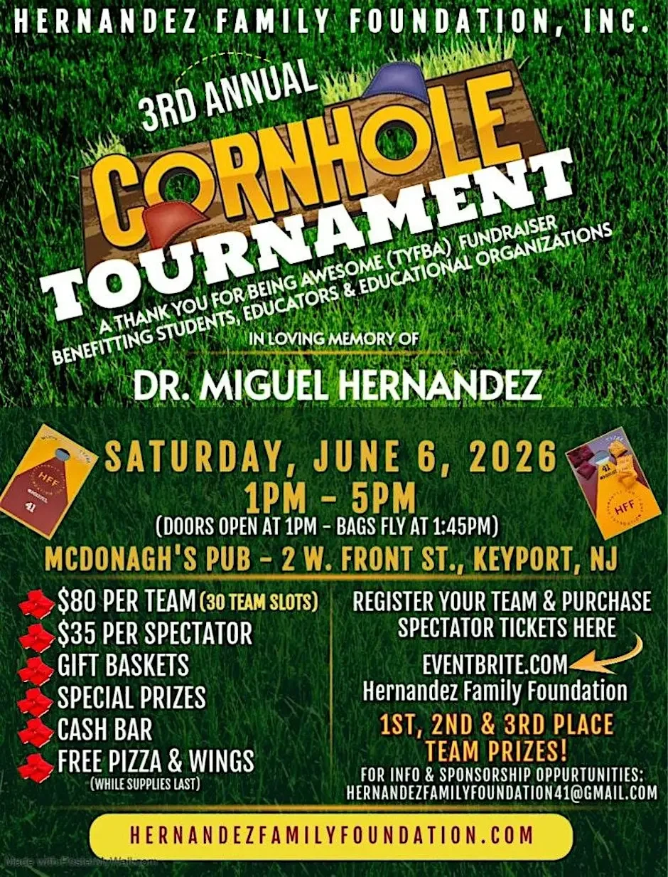 Get ready for a fun-filled day at our 3rd Annual Hernandez Family Foundation Inc. Cornhole Tournament on June 6th at 1:00 PM!